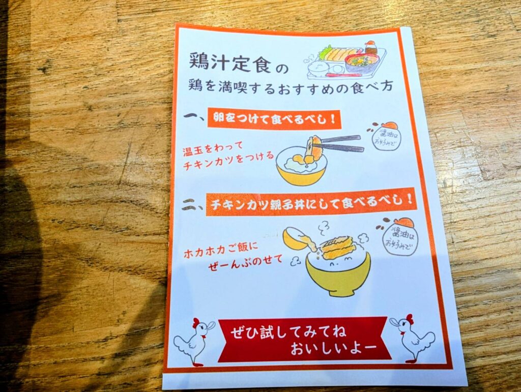 定食を満喫するおすすめの食べ方が描かれた紙もついていて黄金の温泉卵につけられたチキンカツに醤油をちょろりと
