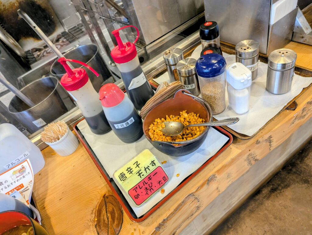 調味料も充実していて唐辛子天かすと鶏汁の相性も抜群で冷えた体も芯からぽかぽかになりました♪