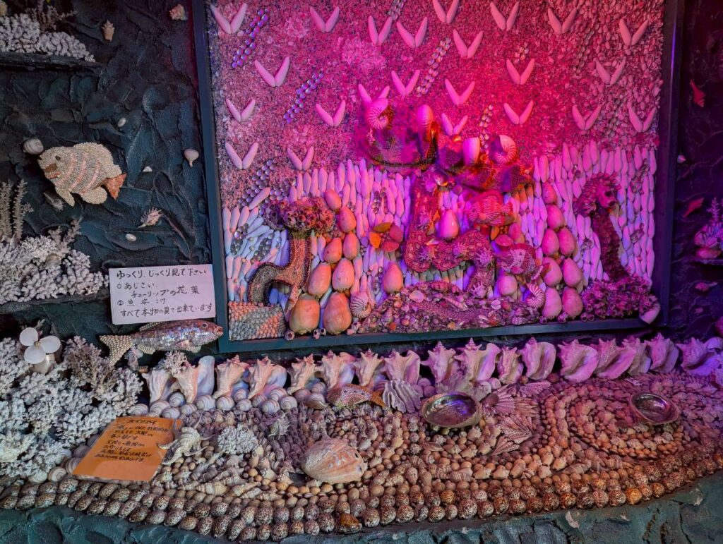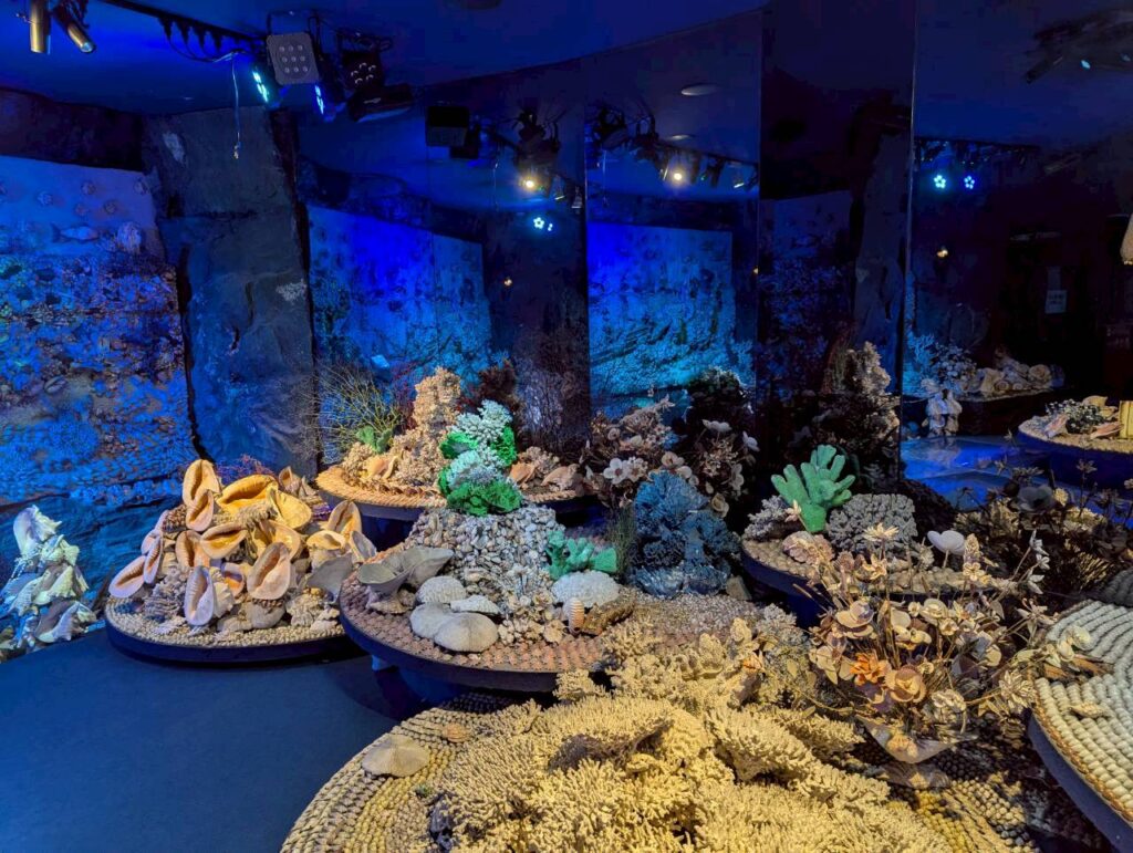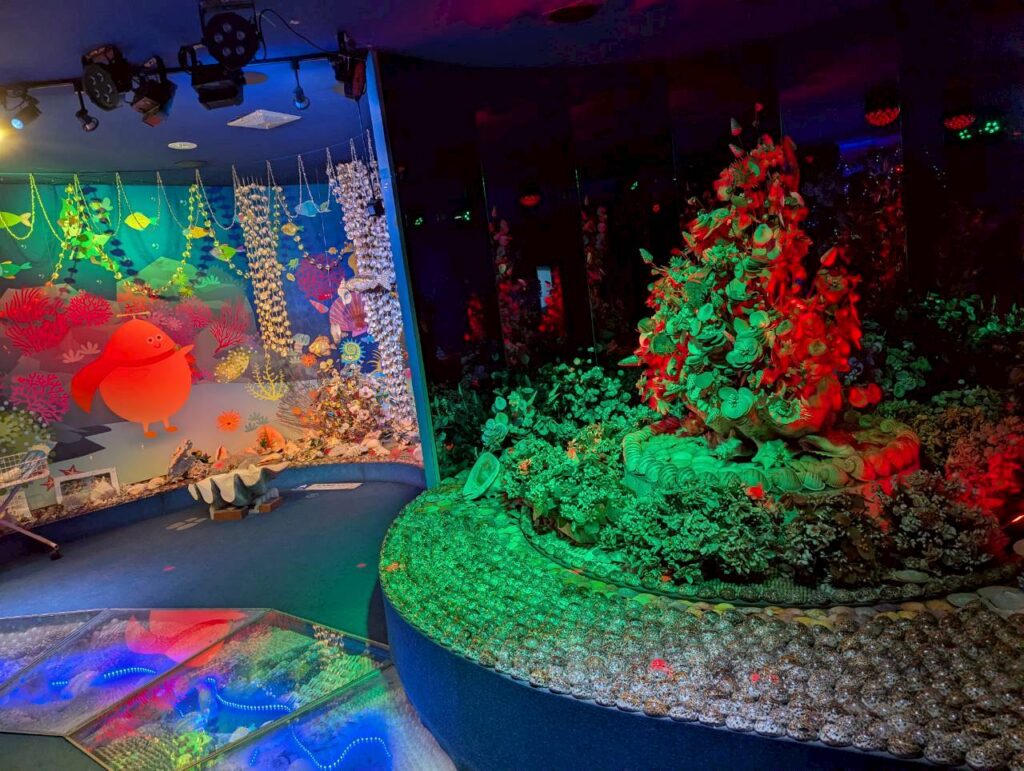 赤や紫、黄色や緑の色とりどりの光に当てられた貝を見ながら薄暗く怪しい空間を進んでいきます