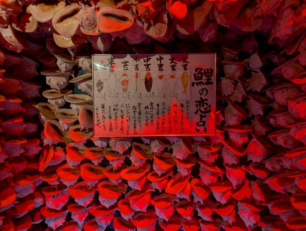 竜宮城を抜けたら鯉の濃い占いコーナーが👀入り口でもらった鯉の餌を生簀に投げ入れ食べた鯉の柄によって運勢を占います。お友達同士やカップルで楽しめそうですね♪