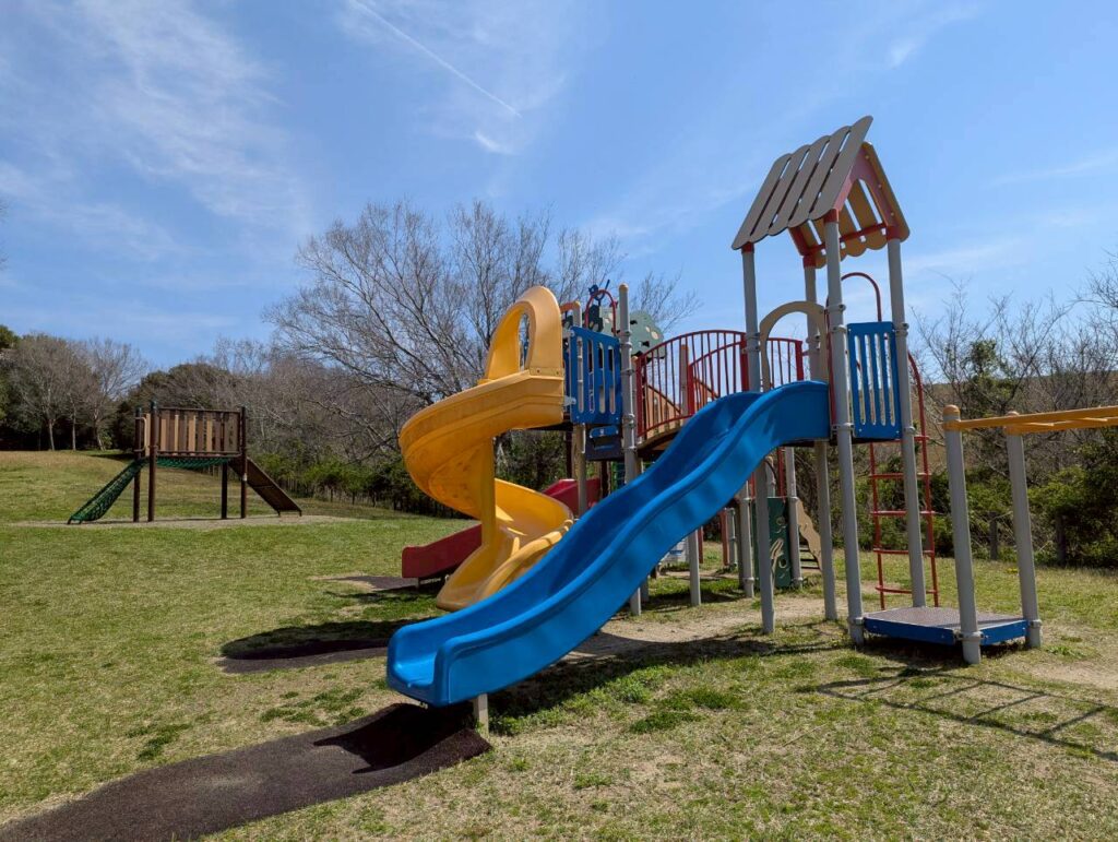 岩屋緑地公園 は、自然の起伏を活かした緑豊かな公園。散策路や展望スポットで四季の景色を楽しめるほか、子ども向け遊具も充実。特に「冒険砦」はすべり台やネット、はしごなどが組み合わさった大型複合遊具で、アスレチック感覚で遊べ、冒険気分が味わえます。家族でのピクニックや軽いハイキングにも最適な、幅広い世代が楽しめるスポットです。